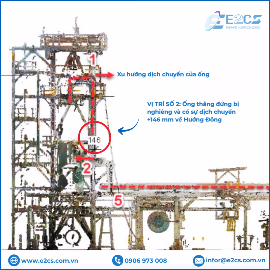 Và thực tế đã chứng minh tầm quan trọng của công nghệ này. Trong dự án khảo sát gần đây tại một nhà máy hóa chất lớn, các kỹ sư của E2CS đã phát hiện một sự cố chấn động: Đường ống công nghệ bị xô lệch tới 146mm – một con số đang âm thầm phá hủy hệ thống mà các phương pháp đo đạc truyền thống đã bỏ qua.